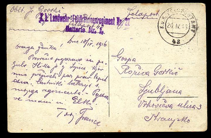 18. aprila 1916 s fronte poslal svoji ženi Rožici nadporočnik iz